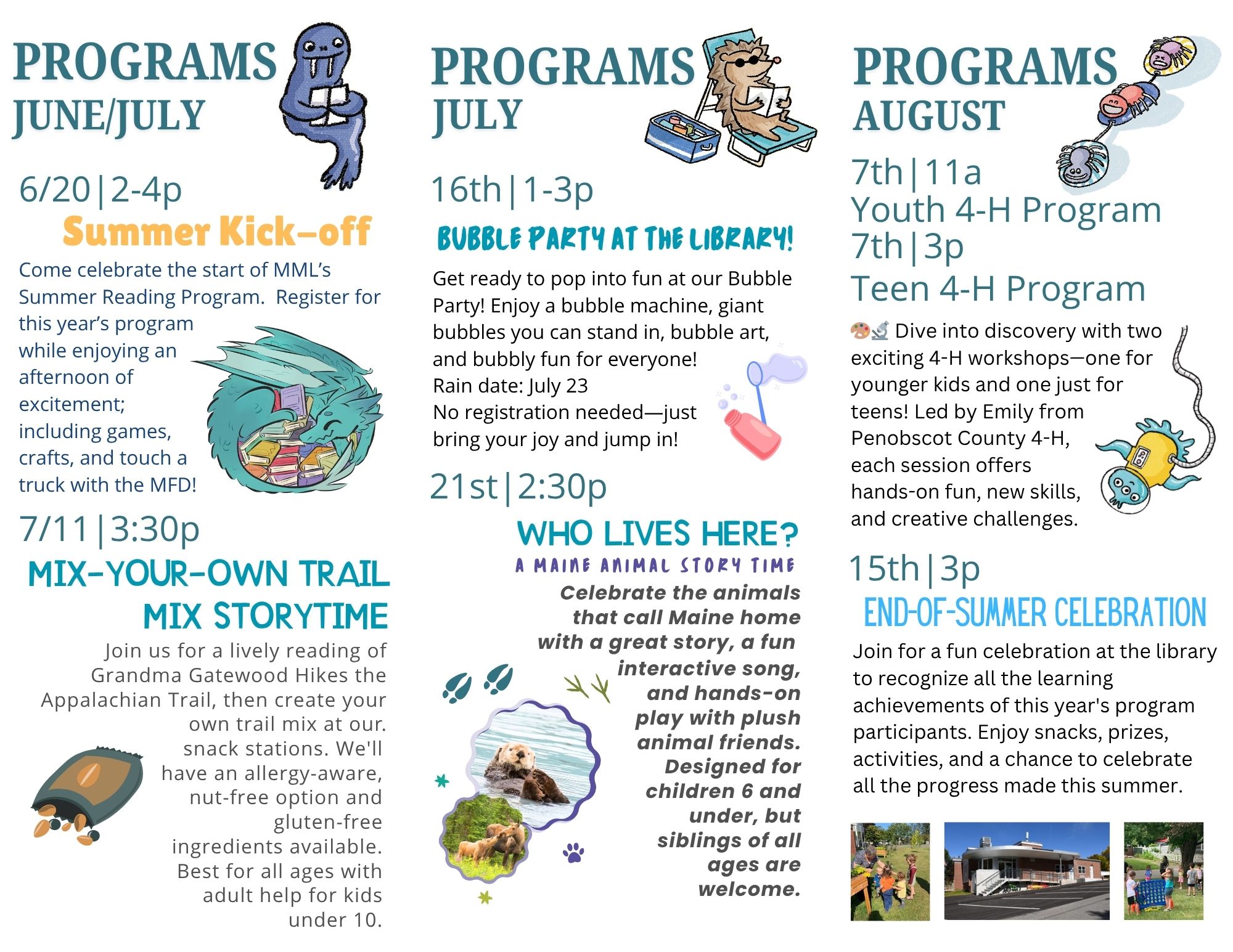 Below are some of the programs we’ll be offering for youth this summer, although there will be additional events added throughout the summer. Click on the image to expand or print it. You can also print our full summer program brochure below: